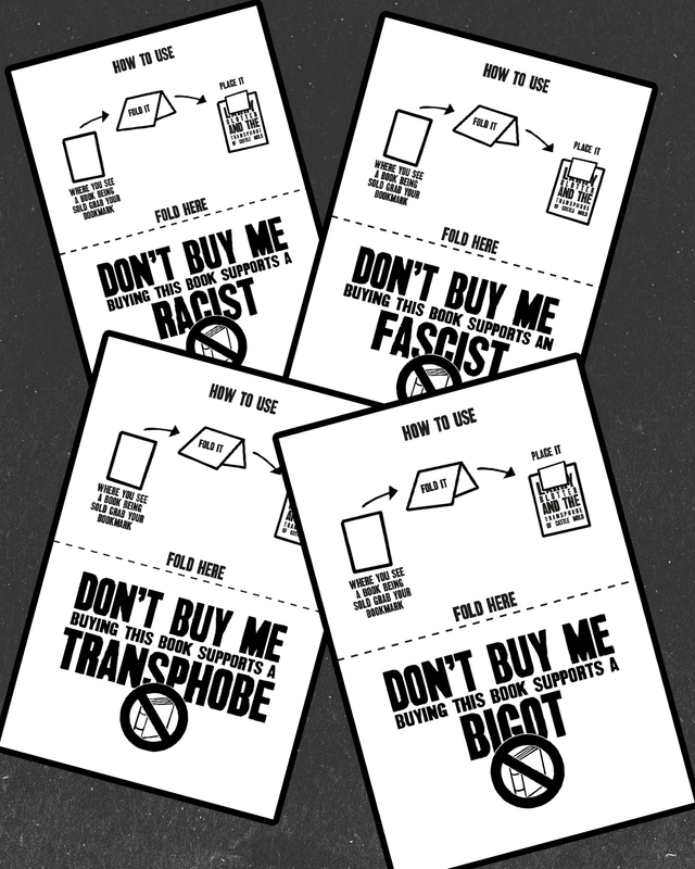 20 Bookmarks for use to bookmark bigots. You ever been out in a shop and want to let people know that they might be buying a book supporting a transphobe or racist. Well now you can in a non-destructive way. Use our handy bookmarks to bookmark a bigot today.